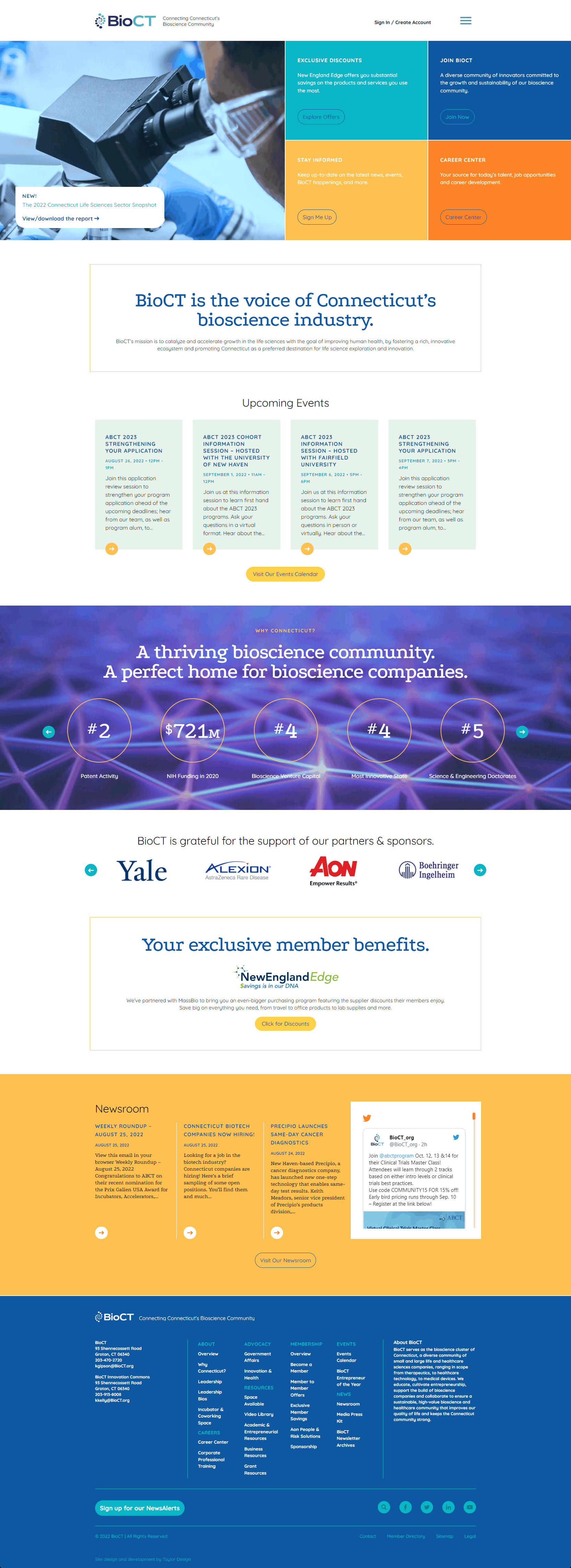 BioCT is the industry voice for bioscience in the state of Connecticut. The organization is dedicated to growing the bioscience ecosystem by supporting innovation, collaboration, networking, education, talent engagement and advocacy. They bring together companies, institutions, entrepreneurs, investors, government, service providers, and other passionate, dedicated people, to create a community to improve patients’ lives and public health, and drive economic growth. This project was completed in 2018 while I was employed at Taylor Design.